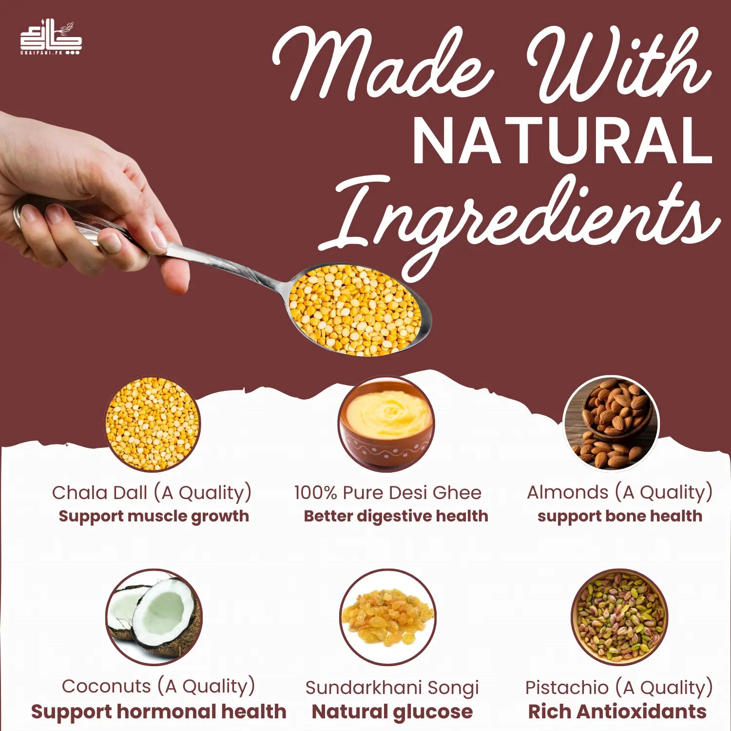 Postpartum Special 02- 1kg Mong Dall, 1kg Alsi ki Pinni. 950ml Kashmiri Chai Qehwa